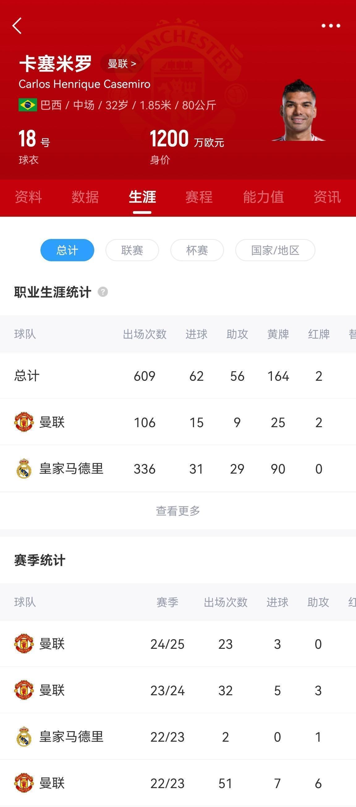 卡塞米罗最为人诟病的,就是随着进入曼联之后,他的表现逐步走低。但是这些年,凡是进入曼联的新球员,都免不了要有高开低走的老路,加上曼联的前场跑动能力随着换帅红利期的过去,逐步慵懒,留给中后场的压力是越来越大了。球员数据逐步不好看也就是情理之中的事情。把曼联全队表现拉胯的原因归咎于兢兢业业的卡塞米罗,显然不靠谱。